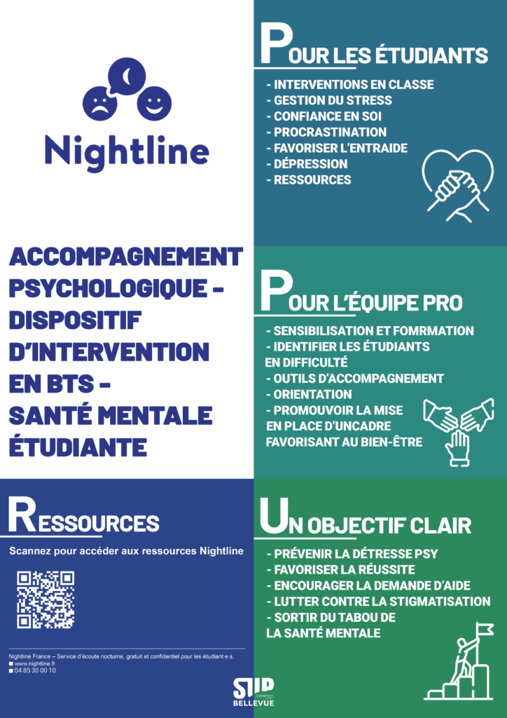 Le dispositif peut être déployé tout au long de l’année et sur les deux ans du cursus de BTS, avec la possibilité d’un partenariat pluriannuel pour toucher l’ensemble des promotions successives. Son objectif est clair : prévenir la détresse psychologique, favoriser la réussite, encourager la demande d’aide, lutter contre la stigmatisation et sortir du tabou de la santé mentale dans le milieu scolaire. En s’appuyant sur Nightline, notre établissement affirme son engagement en faveur d’un environnement d’étude plus bienveillant, où chaque étudiant sait qu’il n’est pas seul et qu’un dispositif d’écoute, de soutien et de ressources est à sa portée.